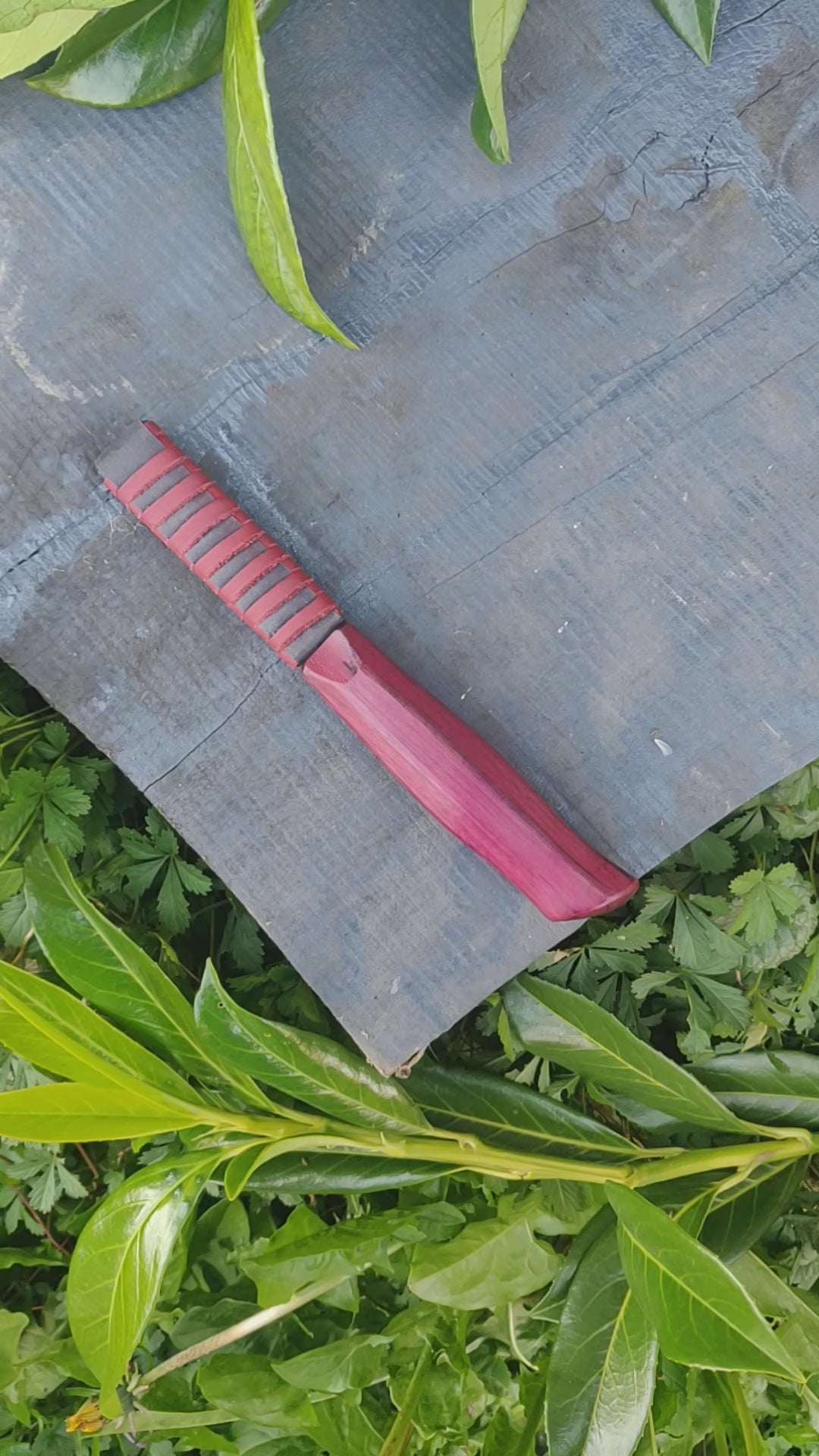 Carving knife made from hand-forged high carbon steel blade and purpleheart wood handle.