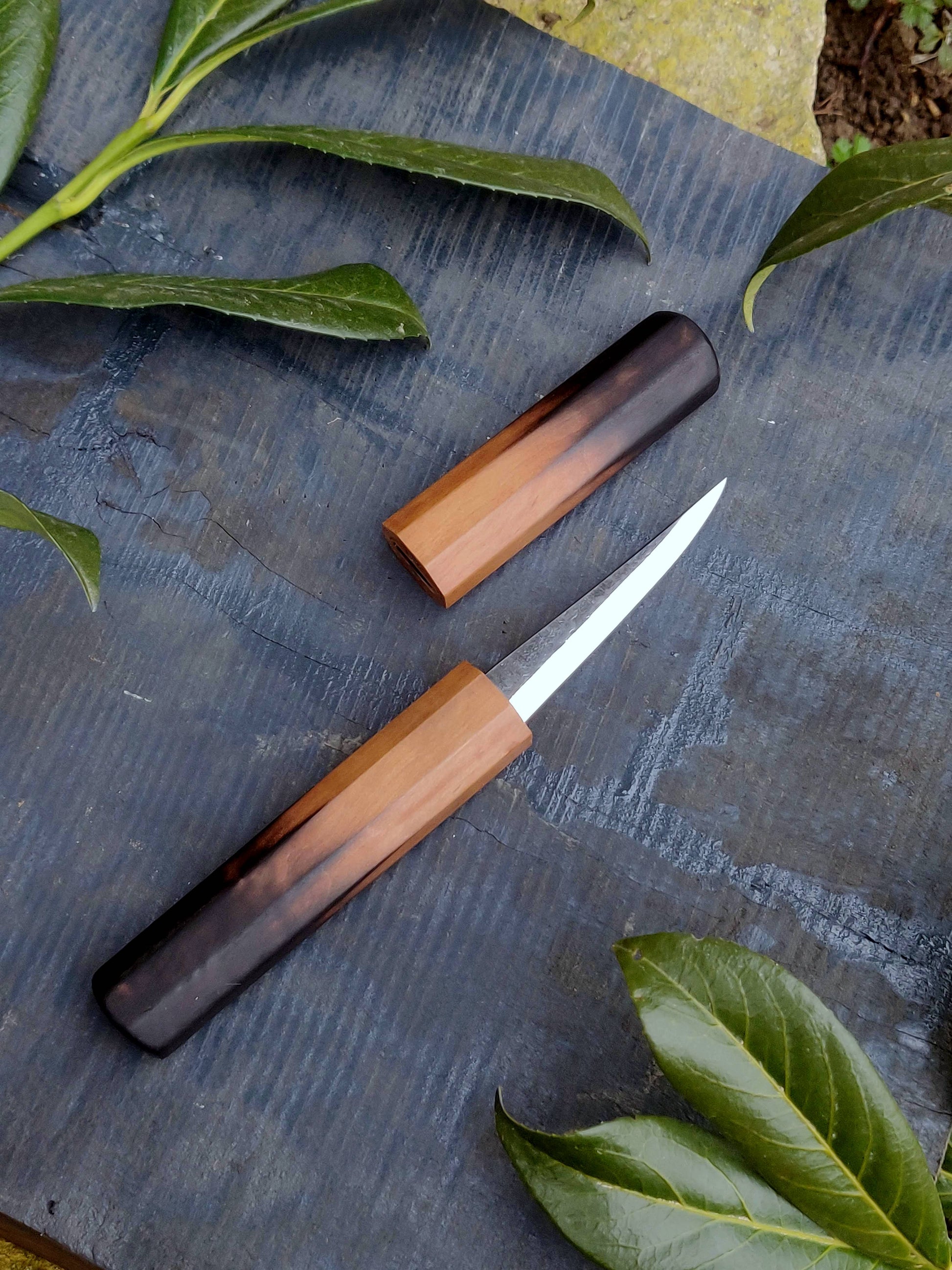 I've crafted a unique knife with a sheath featuring an innovative design that ensures a secure fit without the need for any splitting. Instead, I've incorporated a clever insert that snugly embraces the blade. Both the sheath and handle are fashioned from a single piece of wood, creating a seamless, harmonious look. What's more, they are ingeniously held together not by mere friction, but by discreet magnets. These magnets not only provide a reliable grip but also deliver a satisfying click when the components come together. Countless hours of careful consideration and planning have been devoted to perfecting this design, ensuring both functionality and aesthetics.