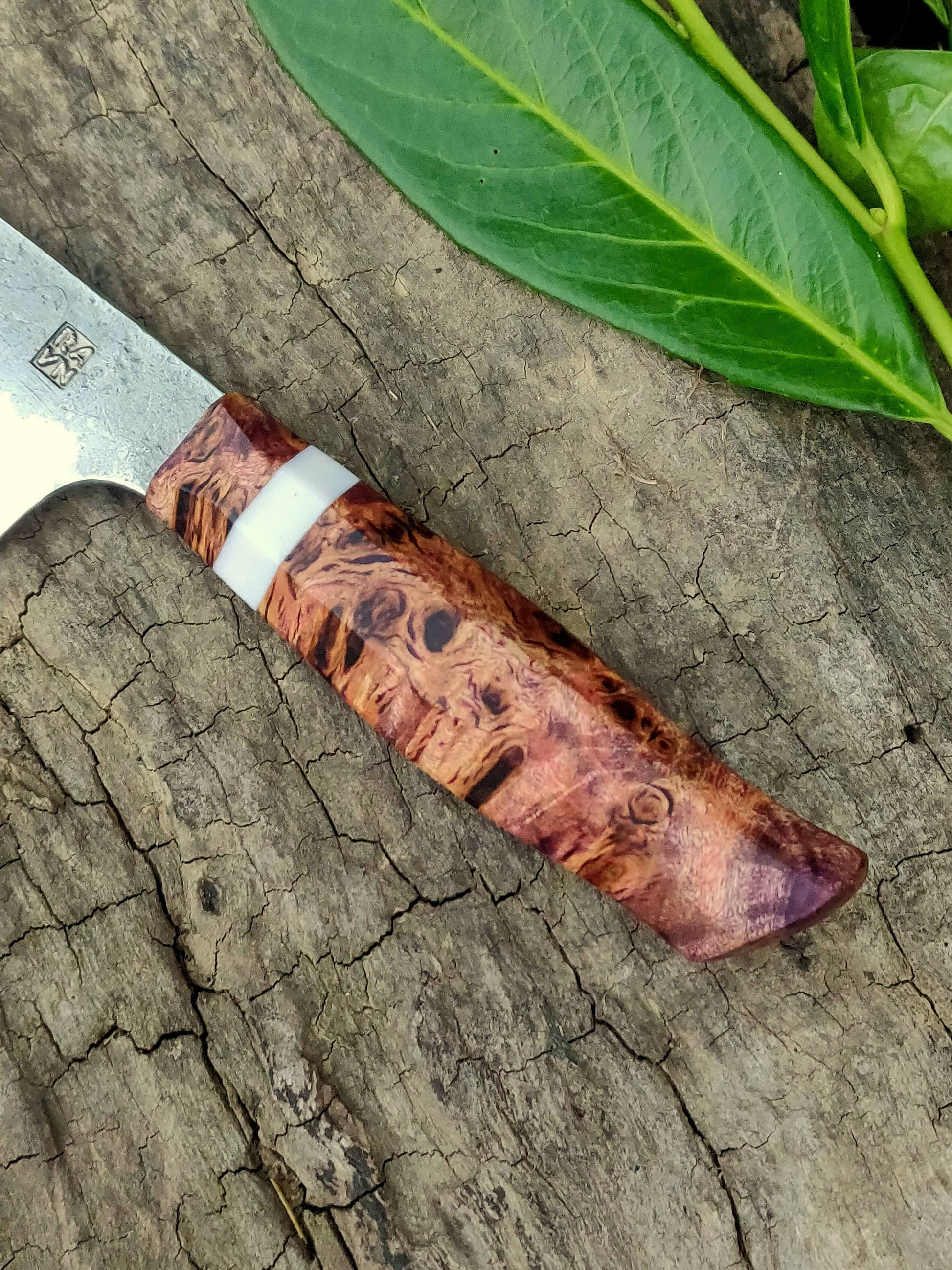 Handle is poplar burl, stabilized by me in multiple colors. The spacer is linen micarta. It's ocatagonaly shaped, cracks are filled with black epoxy. The finish is a mat as I'm not the biggest fan of high gloss. If you like it to have it shiny, please contact me as the handle can be buffed.