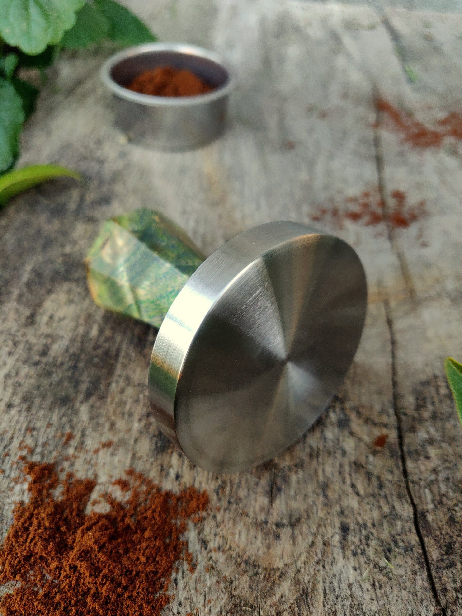 The hand-forged stainless steel coffee tamper, with lathed sides and bottom for a perfect fit.