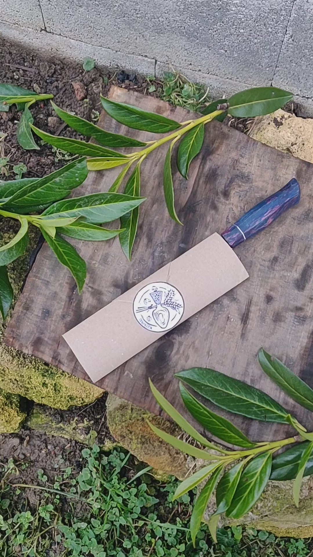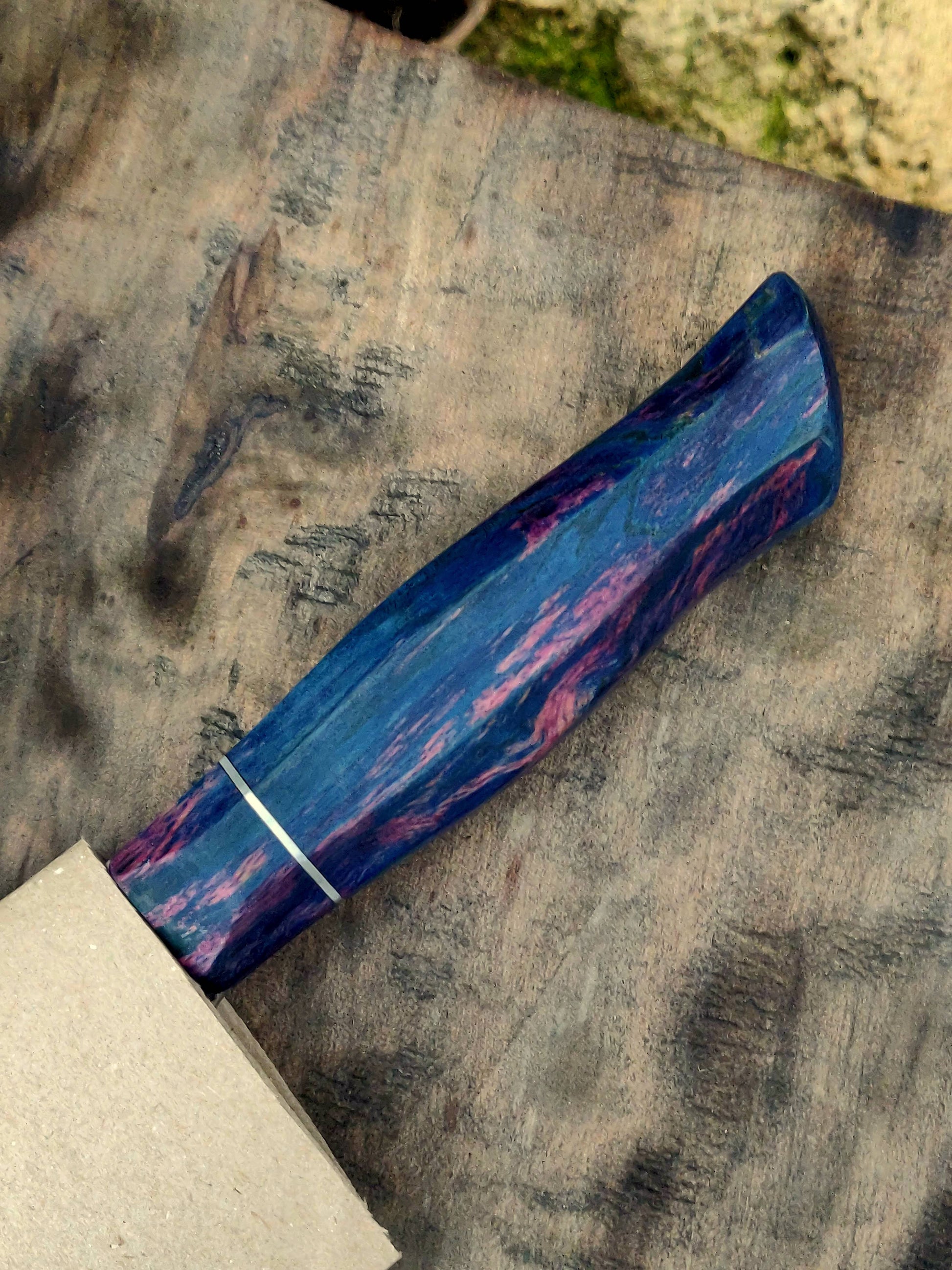 The handle is multi color-stabilized spalted birch, stabilized by me. The spacer is stainless steel. It's octagonally shaped. The finish is a mat (mixture of oils and waxes)