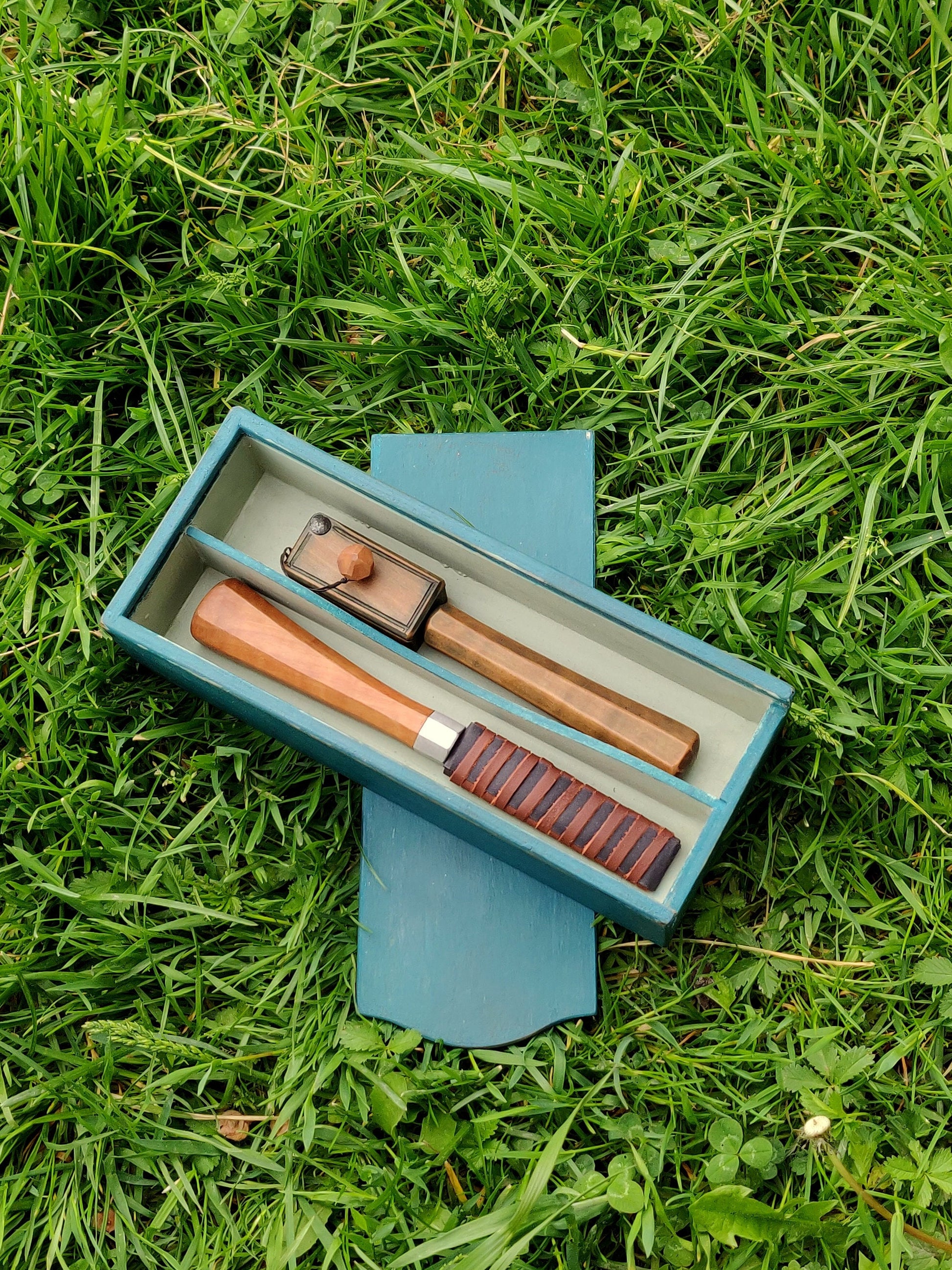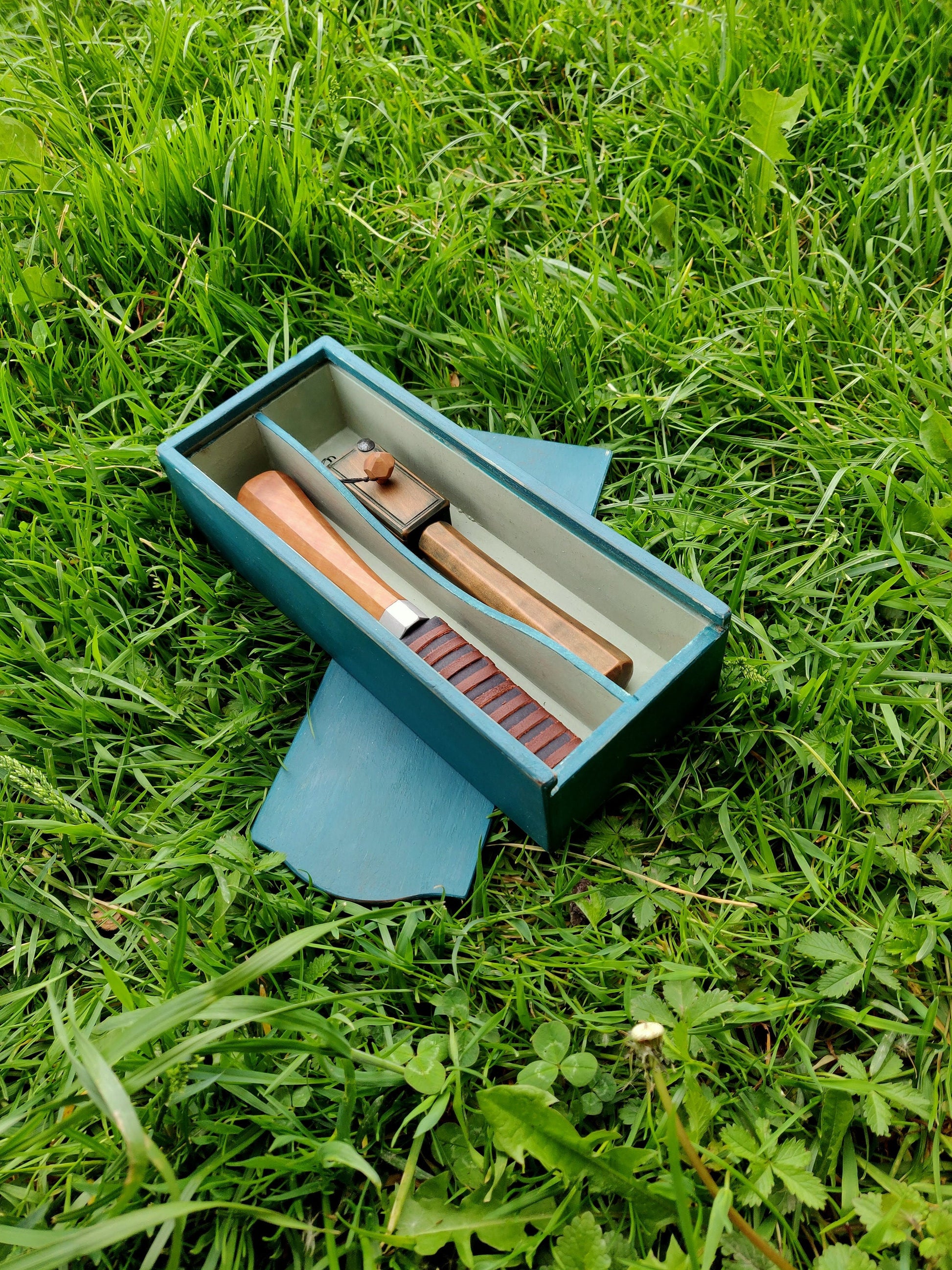 Small two-chamber whittling box made out of layered wood, painted with milk paint.
