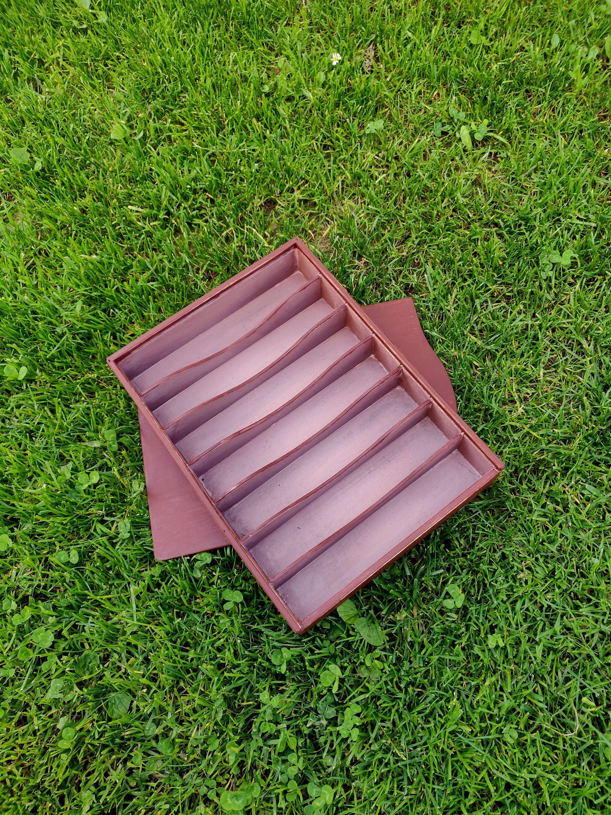 The seven chamber whittling box made out of layered wood painted with milk paint.